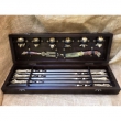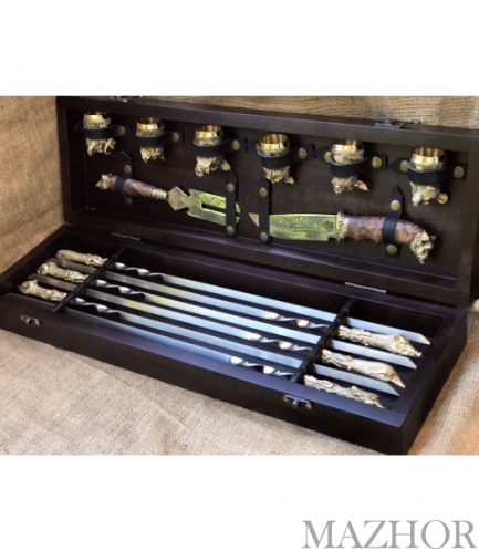 Подарочные шампура продаются в чехлах или кейсах(на выбор). Каждый шампур имеет литую ручку из бронзы(ручка не нагревается). Наборы состоят их шести шампуров. Этого хватит на тесную мужскую компанию.