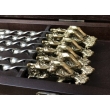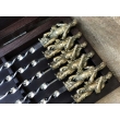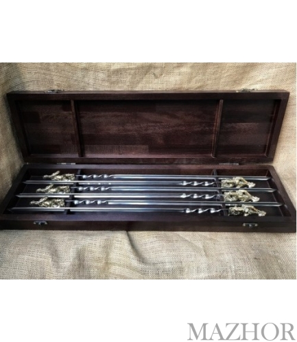 Подарочные шампура продаются в чехлах или кейсах(на выбор). Каждый шампур имеет литую ручку из бронзы(ручка не нагревается). Наборы состоят их шести шампуров. Этого хватит на тесную мужскую компанию.
