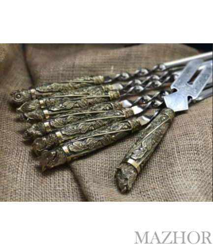 3. Шампура: 6 штук, твердая пищевая нержавеющая сталь толщиной 3 мм. Г-образные Длина шампура: общая - 69 см; рабочая - 50 см Рукоять: ювелирное художественное литье из бронзы(при использовании ручка не нагревается).